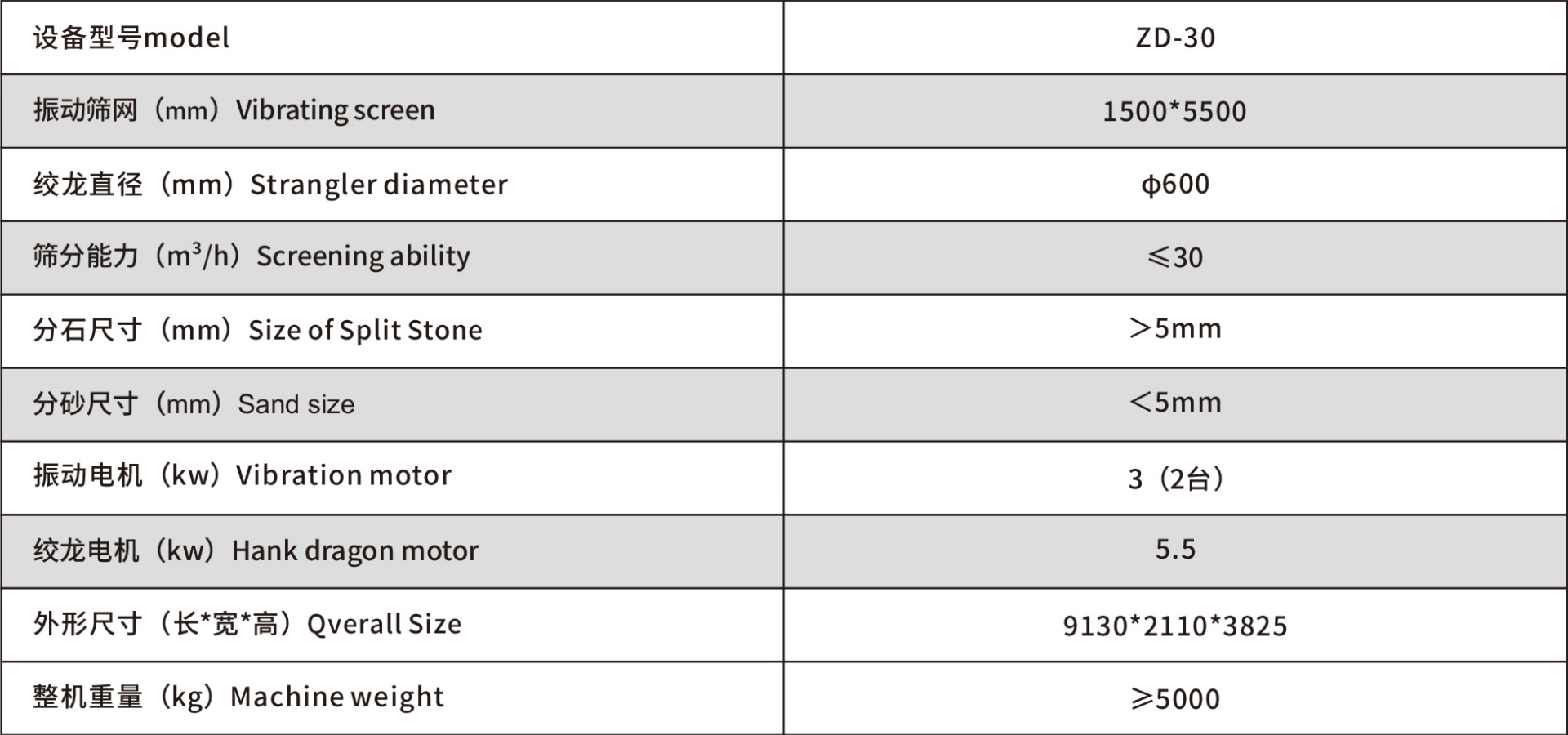ZD-30 sand separator using vibration motor excitation to be the vibration power source,the material is tossed on the screen and moved forward in a straight line. The material is discharged through a special screen high strength vibrating screen. It has the characteristics of low energy consumption, high output, simple structure, easy maintenance, open structure, automatic material arrangement, etc. It is suitable for the concrete mixing station waste material and residual material treatment.