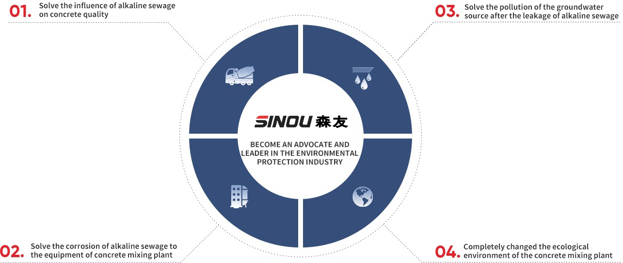 Avoid the harm of high pH wastewater to the water used in the mixing plant and the impact on the quality of concrete, and achieve full utilization of wastewater recycling, and truly achieve zero discharge of wastewater from the mixing plant.