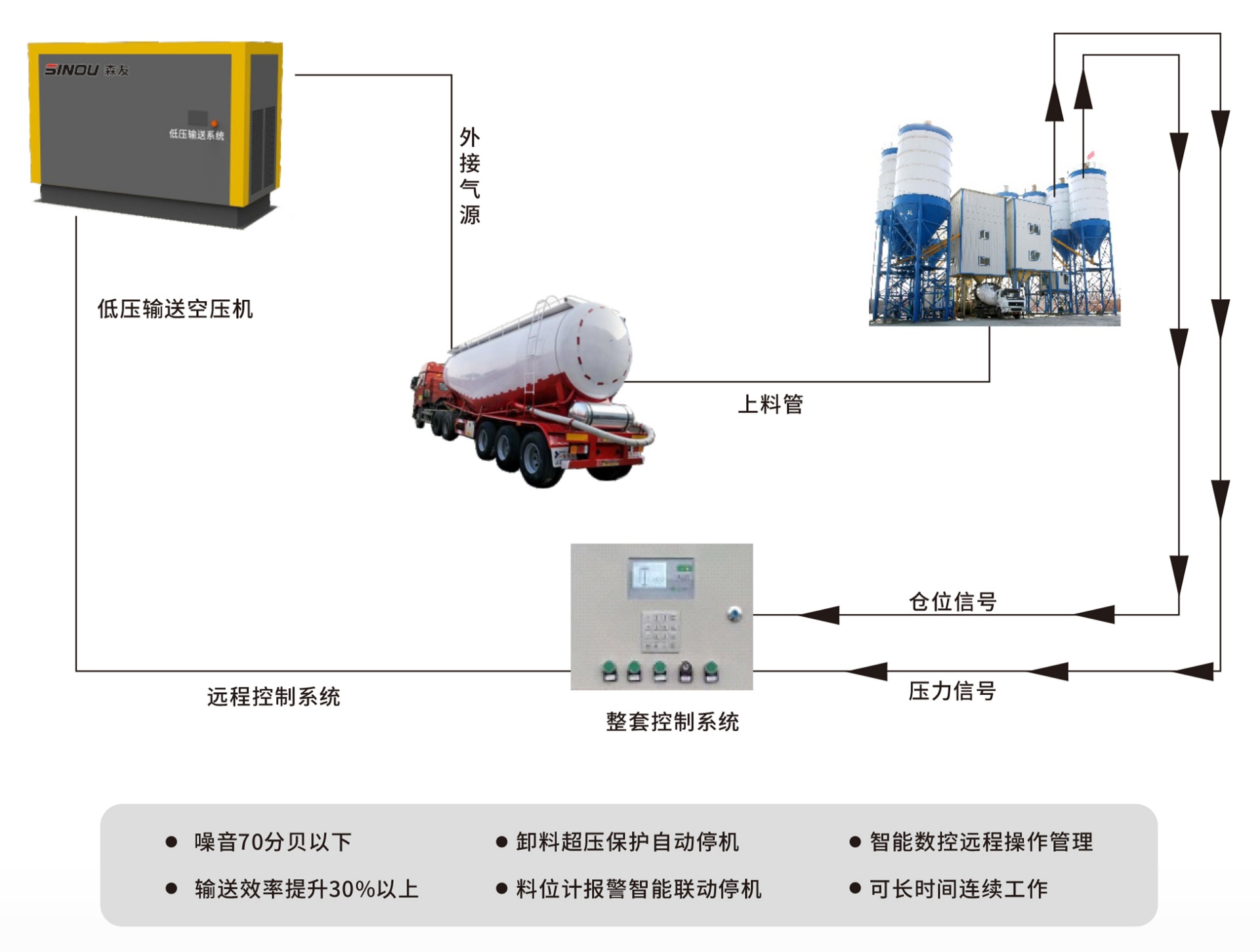 本方案為單臺(tái)低壓螺桿空壓機(jī)粉料輸送方案設(shè)計(jì),空壓機(jī)安裝 在機(jī)房?jī)?nèi)直接使用管道將壓縮空氣接駁在罐車壓縮空氣接駁車,中 間無(wú)需另外接儲(chǔ)氣罐、冷干機(jī)及油水分離設(shè)備,運(yùn)轉(zhuǎn)穩(wěn)定、方便快 捷、節(jié)能高效。