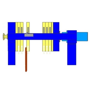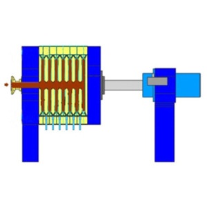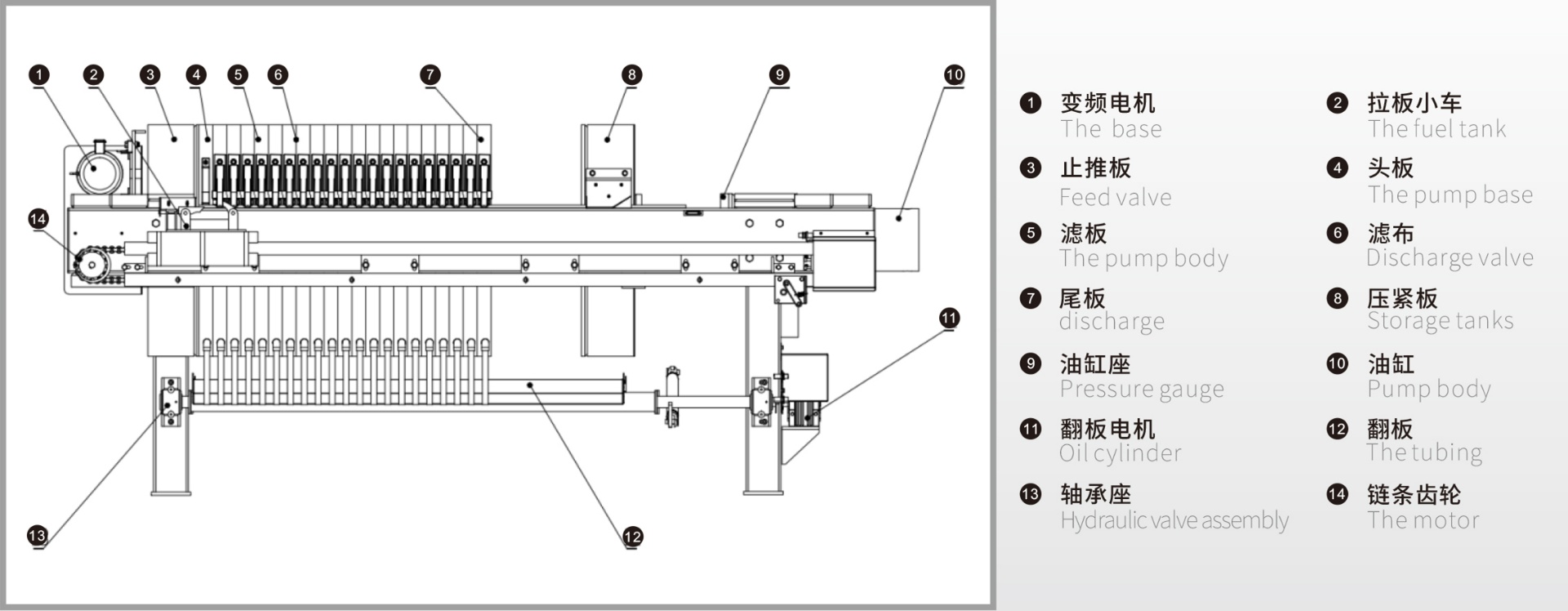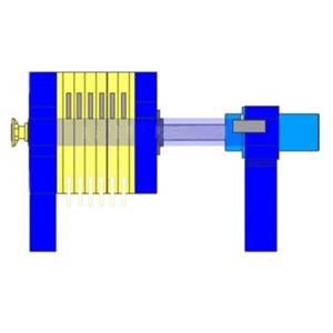 操作液壓系統,使尾板向頭板方向移動,把在頭板和尾板之間的全部濾板壓緊。由此,在相鄰的濾板間構成了中空的密封濾室。